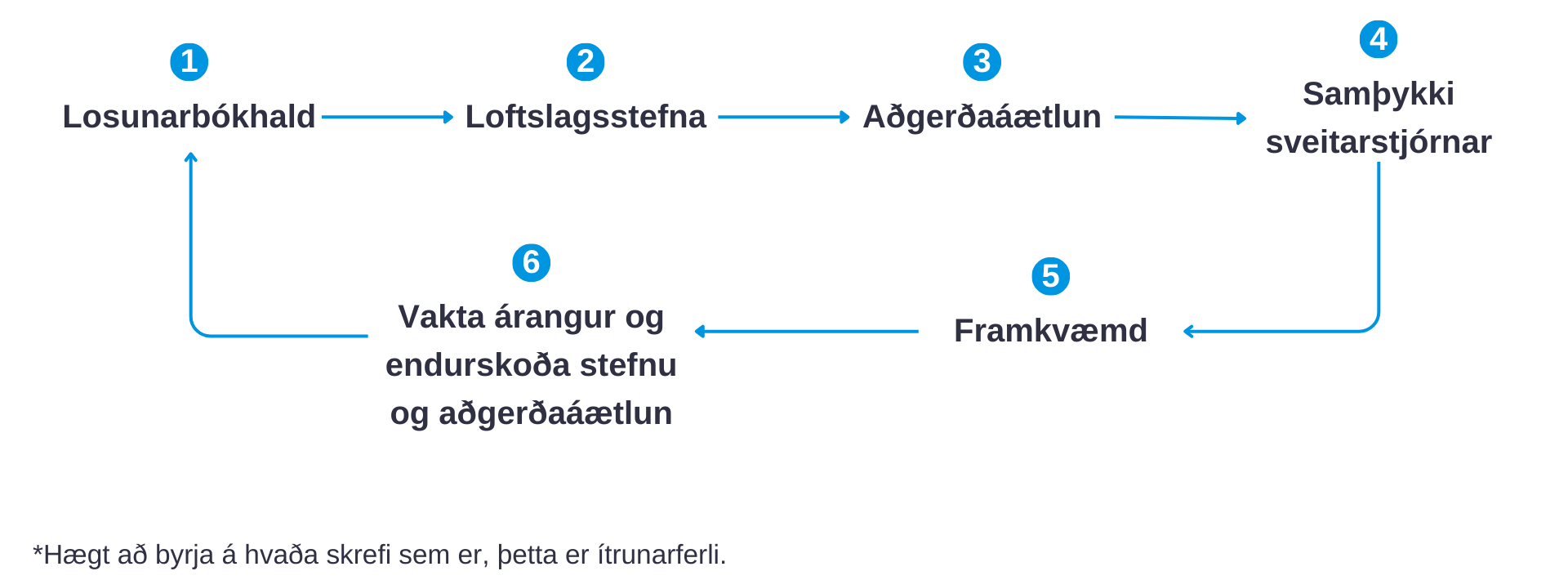 Hér má finna leiðbeiningar um gerð og innleiðingu loftslagsstefnu fyrir sveitarfélög. Við gerð loftslagsstefnu er gott að fylgja eftirfarandi verklagi: